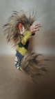 Poseable Young Troll Art Doll 'Tac'. 'Tac' is one of the three troll brothers 'Tic', 'Tac' and 'Toe'. He is a unique, OOAK (one-of-a-kind) fantasy art doll sculpture. No molds have been taken or used. His head, hands and feet are all sculpted in professional polymer clay, hand painted with artist's acrylics and finished with a matte varnish. He stands approx. 7 inches tall, built over a strong wire armature with a soft body. His head, arms, legs and tail are gently poseable. Dressed in a mix of greens with a handmade polymer clay button and a semi-precious stone hanging from his waist. Other materials include Onyx eyes, leather, hand dyed cotton fabrics and luxurious faux fur. This sculpture is not intended as a toy and should be treated as artwork. Dust to clean - do not wet.