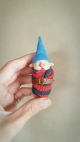 These gnomes are unique, OOAK (one-of-a-kind) fantasy art doll sculptures. No molds have been taken or used. Heads are sculpted in professional polymer clay, hand painted with artist's acrylics and finished with matte and gloss varnish. Typically measuring approx. 9cms in length including hat, built over an armature with a soft body. Gnome Babies are swaddled in striped fabrics with a little leather belt, gold wire buckle and a hand sewn, classic gnome hat.