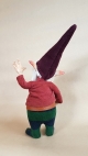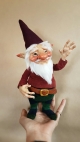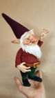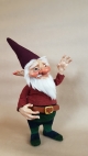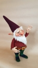 Arvid is a unique, OOAK (one-of-a-kind) fantasy art doll sculpture. No molds have been taken or used. His head, hands and feet are sculpted in professional polymer clay, hand painted with artist's acrylics and finished with matte and gloss varnishes. He is approx. 11 inches tall to the top of his hat (7.5 inches to the top of his head), built predominantly over a strong wire armature with a soft stuffed body. His neck armature is made from a separate plastic ball and socket armature which allows his head to be repeatedly moved and repositioned - the neck armature will never tire or break with normal use. Arms and legs are also gently poseable but care must be taken not to reposition excessively for longevity of this function. Dressed in a burgundy top with green striped stockings, brown leather belt and a pointed purple gnome hat, featuring clothing hand sewn and lightly aged by the artist. Other materials include onyx bead eyes, polymer clay belt buckle and white synthetic fibre hair and beard.