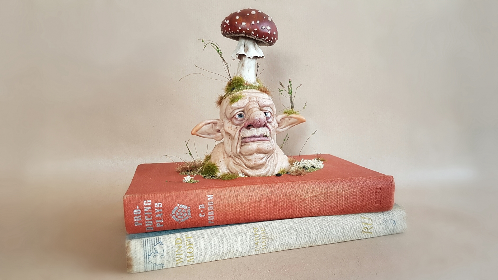 This Book Sculpture is a OOAK (one-of-a-kind) fantasy art sculpture - No molds have been taken or used. Featuring an Ogre sculpted head poking out of carved-out red and blue vintage books. The books have been fixed into position and cannot be opened. Head and mushrooms are all sculpted in Cosclay polymer clay, hand painted with artist's acrylics and finished with matte and gloss varnishes. The bottom book measures approx. 8 inches x 5.5 inches with the total height of the sculpture approx 7 inches tall. Other materials include glass eyes, grass flock and both faux and real preserved moss.