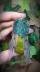 Troll Babies are swaddled in hand dyed cotton with a leaf skeleton, preserved or faux moss and a leather cord.