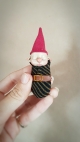 These gnomes are unique, OOAK (one-of-a-kind) fantasy art doll sculptures. No molds have been taken or used. Heads are sculpted in professional polymer clay, hand painted with artist's acrylics and finished with matte and gloss varnish. Typically measuring approx. 9cms in length including hat, built over an armature with a soft body. Gnome Babies are swaddled in striped fabrics with a little leather belt, gold wire buckle and a hand sewn, classic gnome hat.