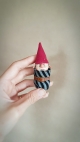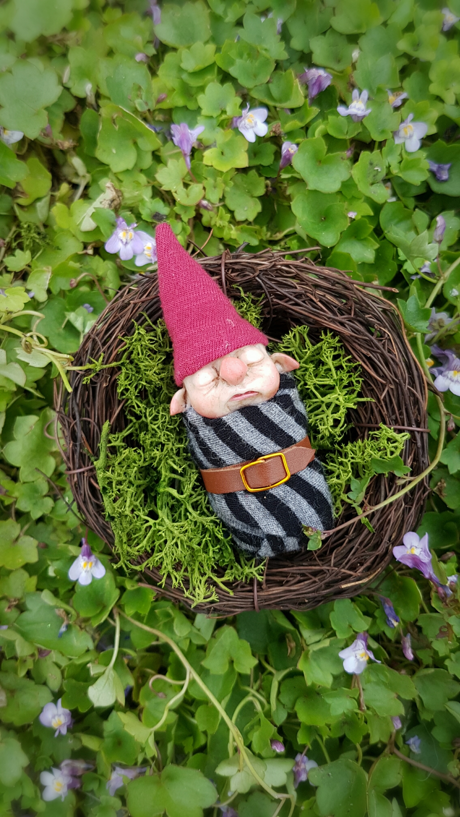 These gnomes are unique, OOAK (one-of-a-kind) fantasy art doll sculptures. No molds have been taken or used. Heads are sculpted in professional polymer clay, hand painted with artist's acrylics and finished with matte and gloss varnish. Typically measuring approx. 9cms in length including hat, built over an armature with a soft body. Gnome Babies are swaddled in striped fabrics with a little leather belt, gold wire buckle and a hand sewn, classic gnome hat.