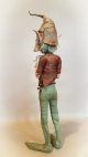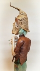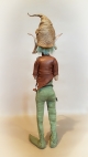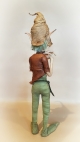 Verdell is a unique, OOAK (one-of-a-kind) fantasy art doll sculpture. No molds have been taken or used. His head, hands, arms and feet are sculpted in professional polymer clay, hand painted with artist's acrylics and finished with matte and gloss varnishes. He is approx. 13 inches tall to the very top of his hat, built predominantly over a strong wire armature with a soft stuffed body. His neck armature is made from a separate plastic ball and socket armature which allows his head to be repeatedly moved and repositioned - the neck armature will never tire or break with normal use. Arms and legs are also gently poseable but care must be taken not to reposition excessively for longevity of this function. Wrists and elbows are fixed in position. Dressed in faux suede green trousers, brown leather top and taupe leather hat with dark green suede tie belt, featuring clothing hand sewn and aged by the artist. Other materials include onyx bead eyes and green synthetic hair. Signed with Faunley Fae initials stamped under foot.