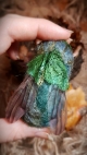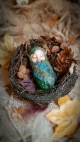 This faerie is a unique, OOAK (one-of-a-kind) fantasy art doll sculpture. No molds have been taken or used. It's head is sculpted in professional polymer clay, hand painted with artist's acrylics and finished with a matte varnish. Measuring approx. 6-7cms in length, built over an armature with a soft body. Silk Moth Faerie Babies are swaddled in lightly needle-felted, hand dyed silk with handmade wings, embellished with real hand dyed Indonesian silk moth cocoons and finished with a sprinkle of loose glitter.