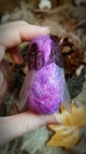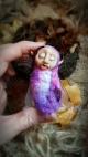 This faerie is a unique, OOAK (one-of-a-kind) fantasy art doll sculpture. No molds have been taken or used. It's head is sculpted in professional polymer clay, hand painted with artist's acrylics and finished with a matte varnish. Measuring approx. 6-7cms in length, built over an armature with a soft body. Silk Moth Faerie Babies are swaddled in lightly needle-felted, hand dyed silk with handmade wings, embellished with real hand dyed Indonesian silk moth cocoons and finished with a sprinkle of loose glitter.