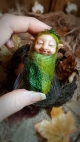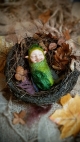 This faerie is a unique, OOAK (one-of-a-kind) fantasy art doll sculpture. No molds have been taken or used. It's head is sculpted in professional polymer clay, hand painted with artist's acrylics and finished with a matte varnish. Measuring approx. 6-7cms in length, built over an armature with a soft body. Silk Moth Faerie Babies are swaddled in lightly needle-felted, hand dyed silk with handmade wings, embellished with real hand dyed Indonesian silk moth cocoons and finished with a sprinkle of loose glitter.