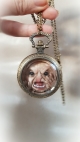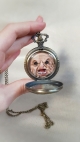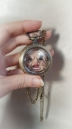 This squashed faerie necklace is a unique, OOAK (one-of-a-kind) fantasy art sculpture. No molds have been taken or used. The head is sculpted in professional polymer clay, hand painted with artist's acrylics and finished with matte and gloss varnishes. The faerie sculpture is trapped inside a pocket watch pendant which can pop open at the front when the button on top is pressed. The diameter of the pendant is approx. 4.5cm and the total necklace chain length is around 90cm, hanging nice and long when worn.