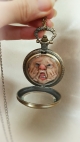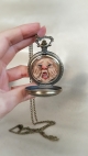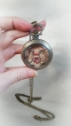 This squashed faerie necklace is a unique, OOAK (one-of-a-kind) fantasy art sculpture. No molds have been taken or used. The head is sculpted in professional polymer clay, hand painted with artist's acrylics and finished with matte and gloss varnishes. The faerie sculpture is trapped inside a pocket watch pendant which can pop open at the front when the button on top is pressed. The diameter of the pendant is approx. 4.5cm and the total necklace chain length is around 90cm, hanging nice and long when worn.