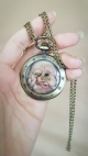 This squashed faerie necklace is a unique, OOAK (one-of-a-kind) fantasy art sculpture. No molds have been taken or used. The head is sculpted in professional polymer clay, hand painted with artist's acrylics and finished with matte and gloss varnishes. The faerie sculpture is trapped inside a pocket watch pendant with Roman numerals around the outside and the clock hands embedded into his poor squashed face! (The hands are fixed and no longer function.) The diameter of the pendant is approx. 4.5cm and the total necklace chain length is around 80cm, hanging nice and long when worn.