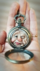 This squashed faerie necklace is a unique, OOAK (one-of-a-kind) fantasy art sculpture. No molds have been taken or used. The head is sculpted in professional polymer clay, hand painted with artist's acrylics and finished with matte and gloss varnishes. The faerie sculpture is trapped inside a pocket watch pendant which can pop open at the front when the button on top is pressed. The diameter of the pendant is approx. 4.5cm and the total necklace chain length is around 90cm, hanging nice and long when worn.