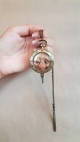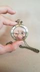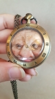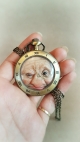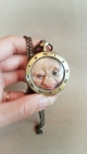 This squashed faerie necklace is a unique, OOAK (one-of-a-kind) fantasy art sculpture. No molds have been taken or used. The head is sculpted in professional polymer clay, hand painted with artist's acrylics and finished with matte and gloss varnishes. The faerie sculpture is trapped inside a watch pendant with Roman numerals around the outside and the clock hands embedded into his poor squashed face! (The hands are fixed and no longer function.) The diameter of the pendant is approx. 4.5cm and the total necklace chain length is around 80cm, hanging nice and long when worn.