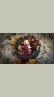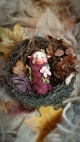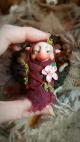 This troll is a unique, OOAK (one-of-a-kind) fantasy art doll sculpture. No molds have been taken or used. It's head is sculpted in professional polymer clay, hand painted with artist's acrylics and finished with a matte varnish. Measuring approx. 6-7cms in length, built over an armature with a soft body. Troll Babies are swaddled in hand dyed cotton with a leaf skeleton, preserved moss and a leather cord.