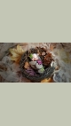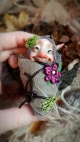 This troll is a unique, OOAK (one-of-a-kind) fantasy art doll sculpture. No molds have been taken or used. It's head is sculpted in professional polymer clay, hand painted with artist's acrylics and finished with a matte varnish. Measuring approx. 6-7cms in length, built over an armature with a soft body. Troll Babies are swaddled in hand dyed cotton with a leaf skeleton, preserved moss and a leather cord.