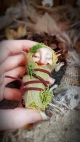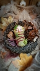 This troll is a unique, OOAK (one-of-a-kind) fantasy art doll sculpture. No molds have been taken or used. It's head is sculpted in professional polymer clay, hand painted with artist's acrylics and finished with a matte varnish. Measuring approx. 6-7cms in length, built over an armature with a soft body. Troll Babies are swaddled in hand dyed cotton with a leaf skeleton, preserved moss and a leather cord.