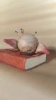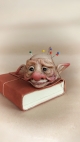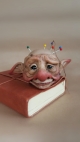 This pincushion is a unique, OOAK (one-of-a-kind) fantasy art sculpture. No molds have been taken or used. Sculpted in professional polymer clay, hand painted with artist's acrylics and finished with matte and gloss varnishes. Onyx bead eyes. A cushion made of flesh tone fabric, filled with stuffing batting gives him a soft pincushion head to insert needles and pins. Approx. 2.25 inches tall to the top of the cushion, fixed to a small wooden disc base. This sculpture is not intended as a toy and should be treated as artwork. Dust to clean - do not wet. Please note: no pins or needles are included with the sculpture.