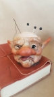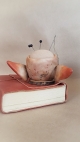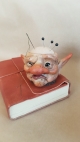 This pincushion is a unique, OOAK (one-of-a-kind) fantasy art sculpture. No molds have been taken or used. Sculpted in professional polymer clay, hand painted with artist's acrylics and finished with matte and gloss varnishes. Onyx bead eyes. A cushion made of flesh tone fabric, filled with stuffing batting gives him a soft pincushion head to insert needles and pins. Approx. 2 inches tall to the top of the cushion, fixed to a rustic wood slice base.