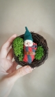 These gnomes are unique, OOAK (one-of-a-kind) fantasy art doll sculptures. No molds have been taken or used. Heads are sculpted in professional polymer clay, hand painted with artist's acrylics and finished with matte and gloss varnish. Typically measuring approx. 6-7cms in length, built over an armature with a soft body. Gnome Babies are swaddled in striped fabrics with a little leather belt, gold wire buckle and a hand sewn, classic gnome hat. Nest is decorated with real preserved moss.